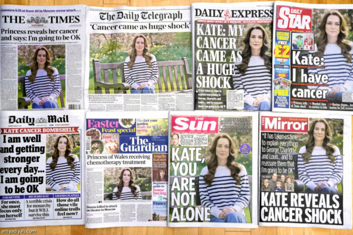 وكتبت صحيفة “ذي صن” في عنوانها العريض “كايت، أنتِ لست وحدك”، فيما اقتبست صحيفة “ذي تايمز” من الكلمات المتفائلة للأميرة معنونة “سوف أتجاوز ذلك”.