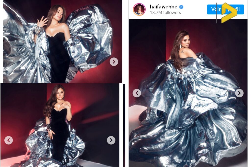 واحدة من أكثر الإطلالات التي أثارت الجدل والإعجاب، كانت بفستان أسود ضيّق مكشوف الكتفين، ترافق مع كاب فضي ضخم أضفى على المظهر لمسة درامية فضائية، ووصفت وهبي هذا التصميم بتعليق “من كوكب آخر”، وهي عبارة اختزلت الغرابة المقصودة والتفرّد في الأسلوب.