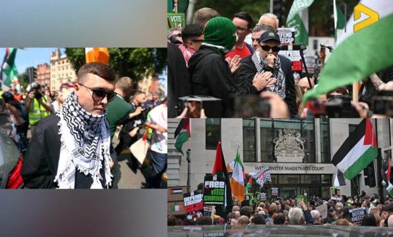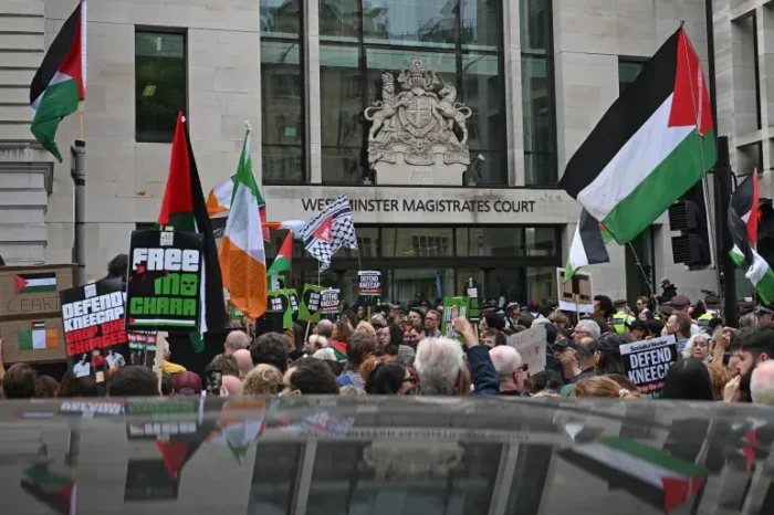 وتجمّع مئات المؤيدين أمام المحكمة هاتفين “الحرية لفلسطين”، ورافعين أعلاما فلسطينية وإيرلندية، كما رفعوا لافتات تطالب بـ”الحرية لمو شارا”.