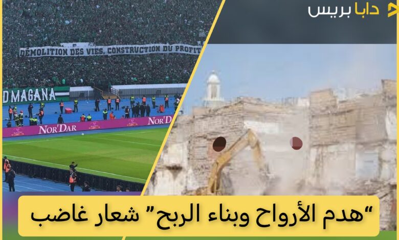 فقد رفع أنصار الرجاء الرياضي لافتة داخل ملعب محمد الخامس تنتقد عمليات الهدم والترحيل التي تطال بعض الأحياء الشعبية، وكتب عليها شعار حاد: “هدم الأرواح، وبناء الربح”، في تعبير واضح عن رفضهم لآثار مشاريع التهيئة العمرانية الجارية.