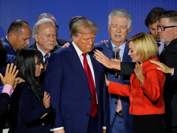 ورأينا من قبل حلقة من المشعوذين الدينيين متحلّقين حول ترامب في صلاة لاستجلاب النصر.
